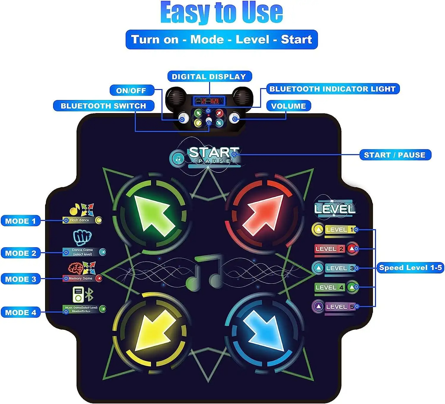 Covorasul de Dans Interactiv cu Bluetooth si Lumini pentru Copii ofera o experienta de joc captivanta, transformand orice incapere intr-o adevarata pista de dans. Acest covoras ajuta la dezvoltarea coordonarii motorii, a ritmului si a simtului muzical al copilului tau, prin miscari dinamice si jocuri muzicale interactive. Conecteaza-l la telefon prin Bluetooth si lasa copilul sa danseze pe melodiile sale preferate.