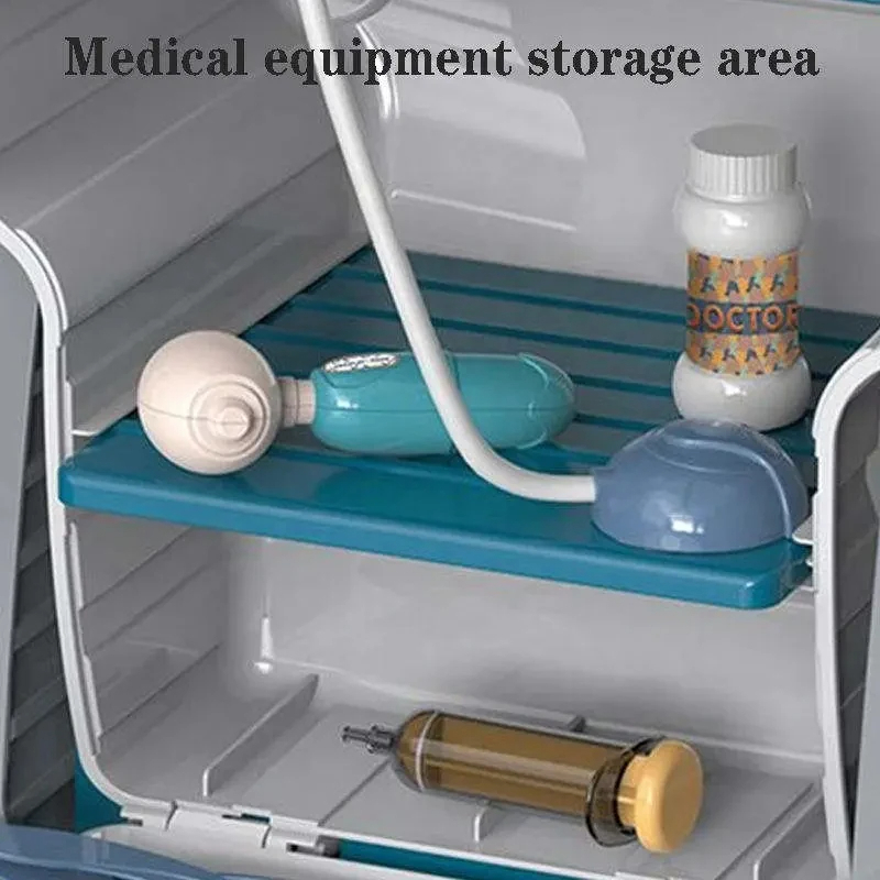 Ce piese contine: Setul include 15 piese: monitor EKG, ecran X-Ray cu imagini detasabile, stetoscop, seringa, termometru, medicamente simulate, si alte instrumente medicale esentiale. Caruciorul este prevazut cu spatii pentru depozitare, fiind astfel ideal pentru o organizare usoara a pieselor.
