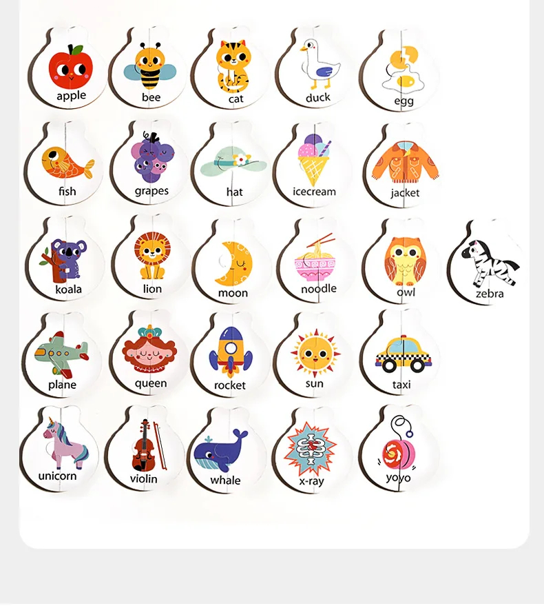 Setul contine 52 de piese colorate care se imbina doua cate doua, ajutand copilul sa asocieze fiecare litera cu o imagine corespunzatoare. Prin potrivire corecta, cel mic invata sa recunoasca literele alfabetului si sa faca legatura dintre sunet, simbol si obiect.