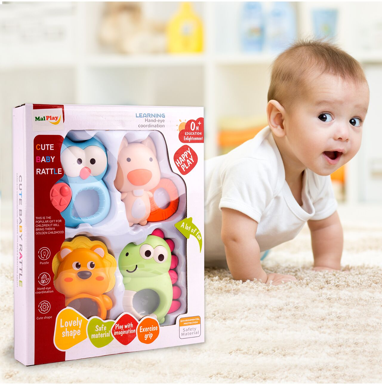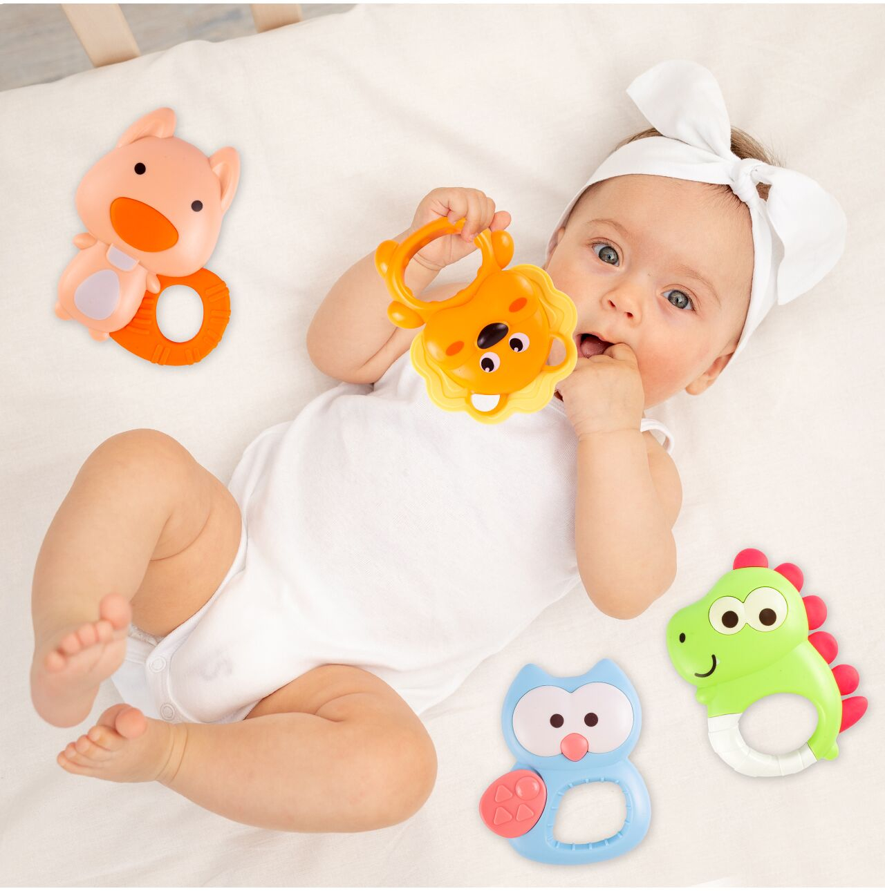 Culorile vibrante si calde ale jucariilor vor captiva atentia bebelusului si il vor starni sa exploreze. Fiecare jucarie de dentitie are o forma adorabila, de la bufnita cu aripi mobile la leul cu coama de cauciuc, veverita cu o coada si un nas de cauciuc, si dinozaurul cu spate de cauciuc.