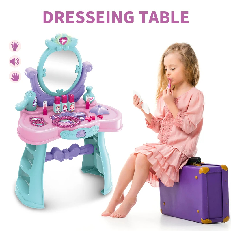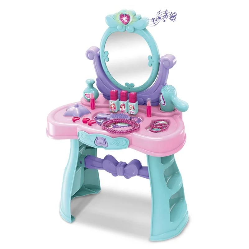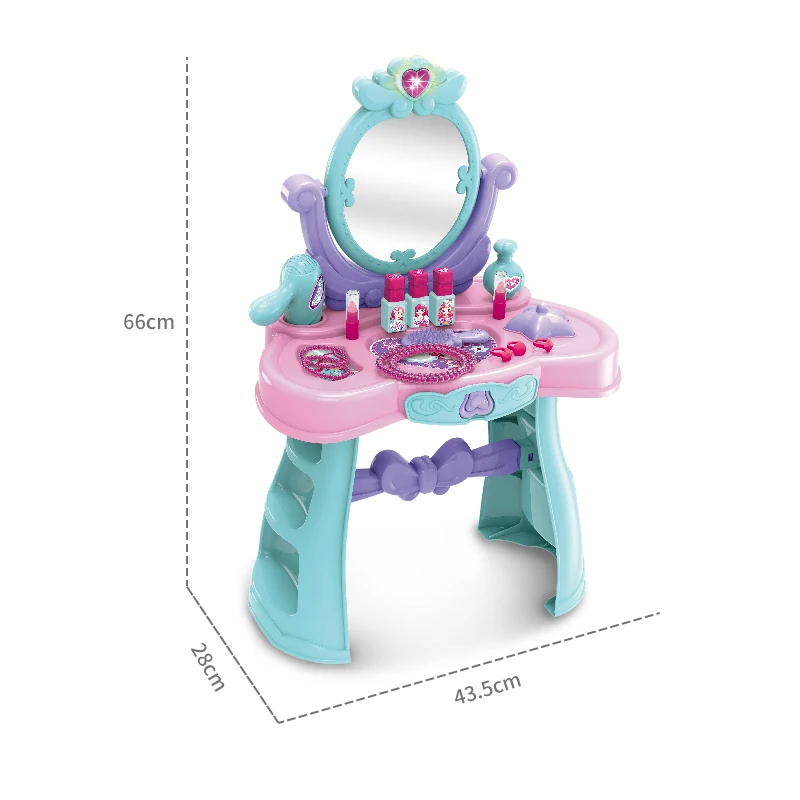 Fetitele pot folosi fiecare accesoriu pentru a se aranja, imitand activitatile adultilor. Masa are efecte sonore si luminoase care se activeaza prin apasarea unui buton, oferind o experienta realista si captivanta.