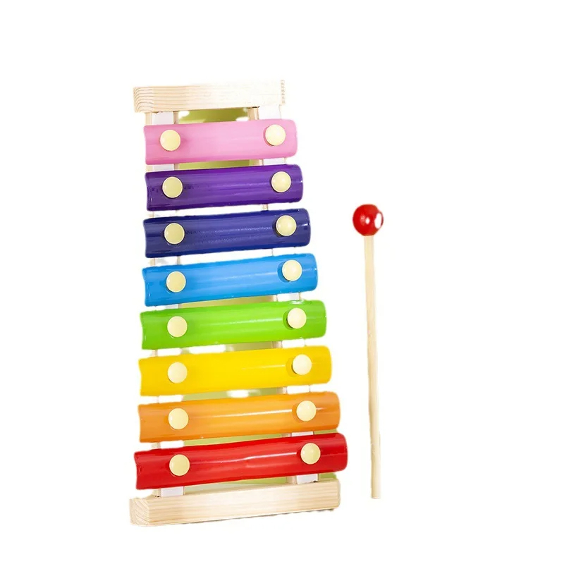 Copilul poate folosi cele doua bete din lemn pentru a lovi cele 8 placi metalice colorate, fiecare emitiand un sunet distinct. Acest mod de joaca ajuta la dezvoltarea capacitatii de recunoastere a notelor muzicale si incurajeaza creativitatea in compunerea de melodii simple.