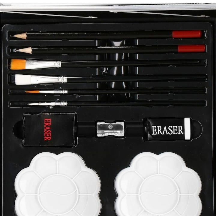 Setul de pictura si desen cu 145 de piese este alegerea perfecta pentru copii si pentru cei care descopera pasiunea pentru arta. Contine o varietate completa de instrumente – creioane colorate, carioci, acuarele, pasteluri si accesorii utile – toate atent organizate intr-o valiza eleganta din aluminiu, cu maner.
