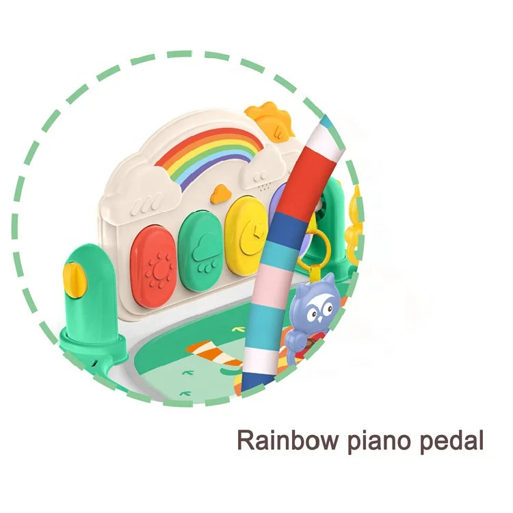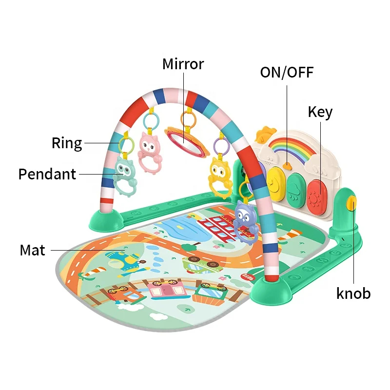 Setul contine un pian curcubeu cu mai multe sunete, 5 jucarii suspendate (4 animalute colorate si o oglinda), detasabile si sigure pentru bebelusi.